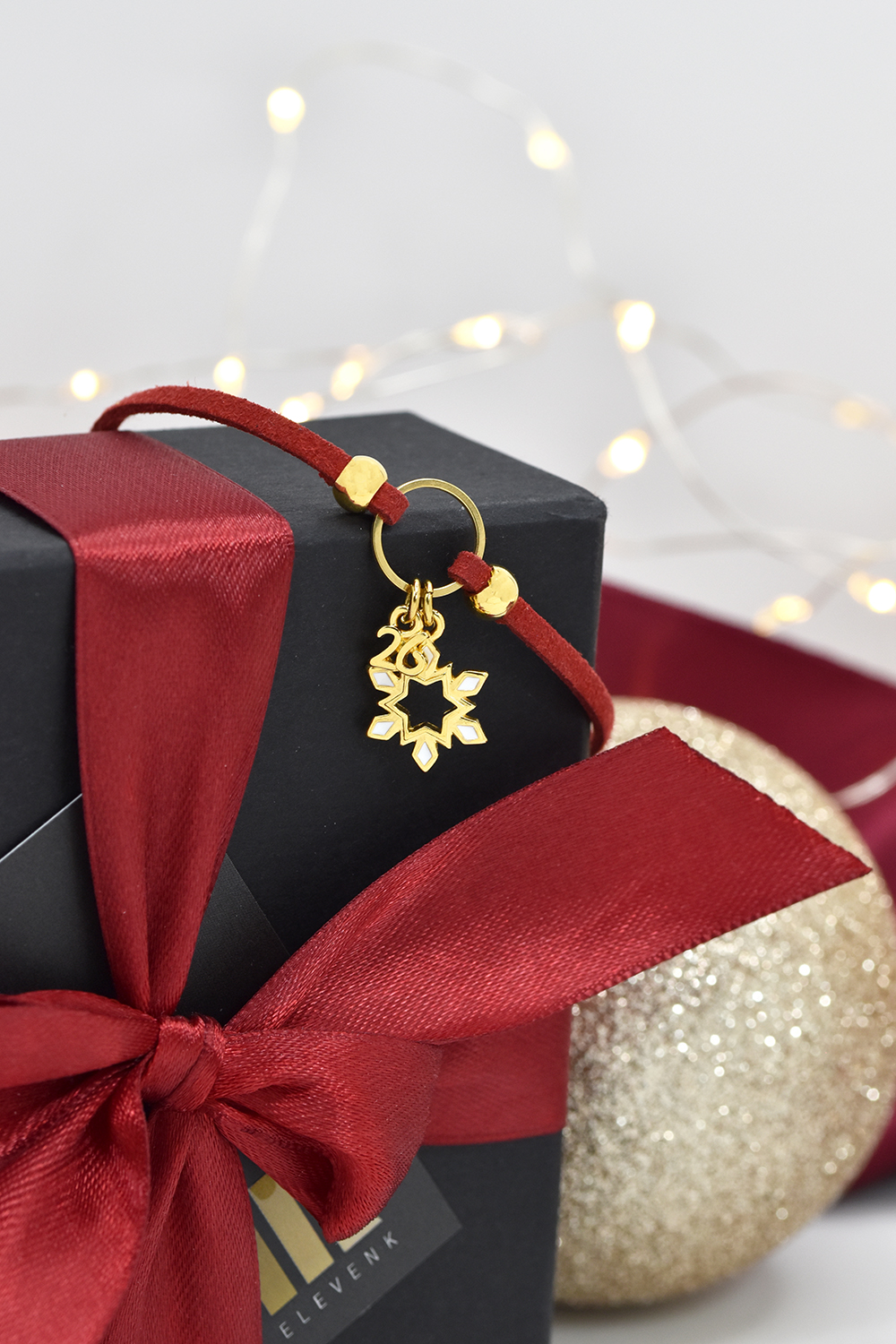 A 2026 lucky charm bracelet featuring a suede cord available in various colors and an enamel snowflake or mistletoe pendant. A delicate symbol of good luck, protection, and positive energy for the new year.