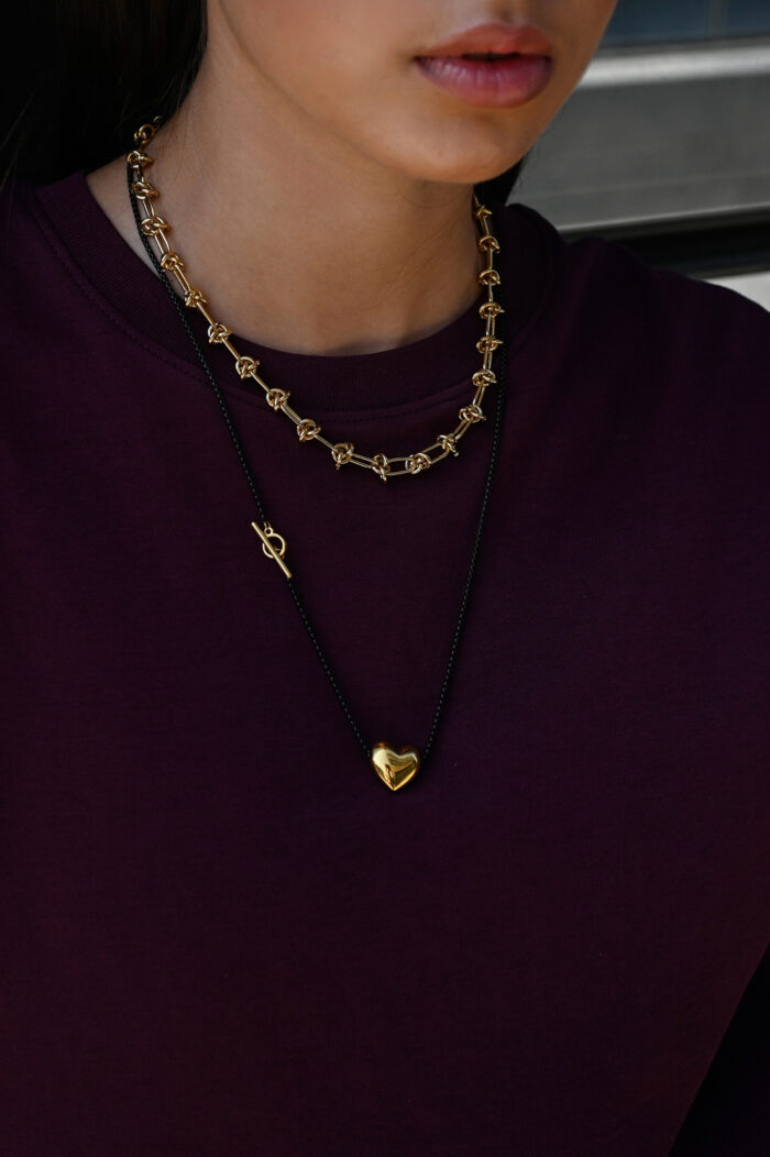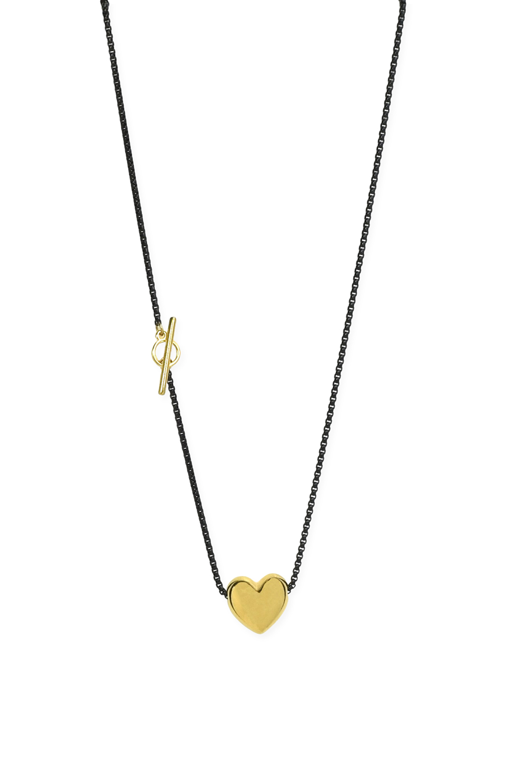 Η λεία, συμπαγής καρδιά σε χρυσή ή ασημί απόχρωση συνδυάζεται με λεπτή αλυσίδα από ανοξείδωτο ατσάλι σε μαύρο ή ασημί χρώμα αντίστοιχα και ιδιαίτερο κούμπωμα στο πλάι.