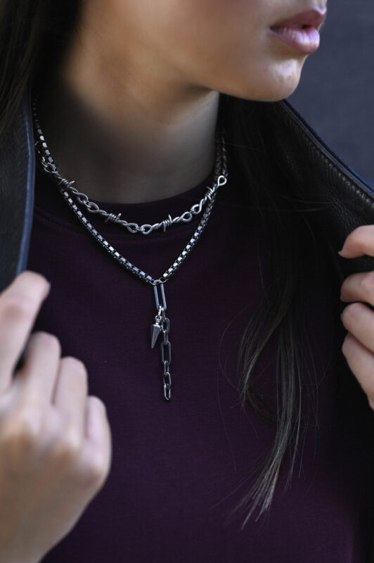 Φοριέται μόνο του για ένα minimal statement look ή σε layering με το δεύτερο κολιέ του σετ REBEL, για ένα αποτέλεσμα με rock ένταση και ανεπιτήδευτη κομψότητα.