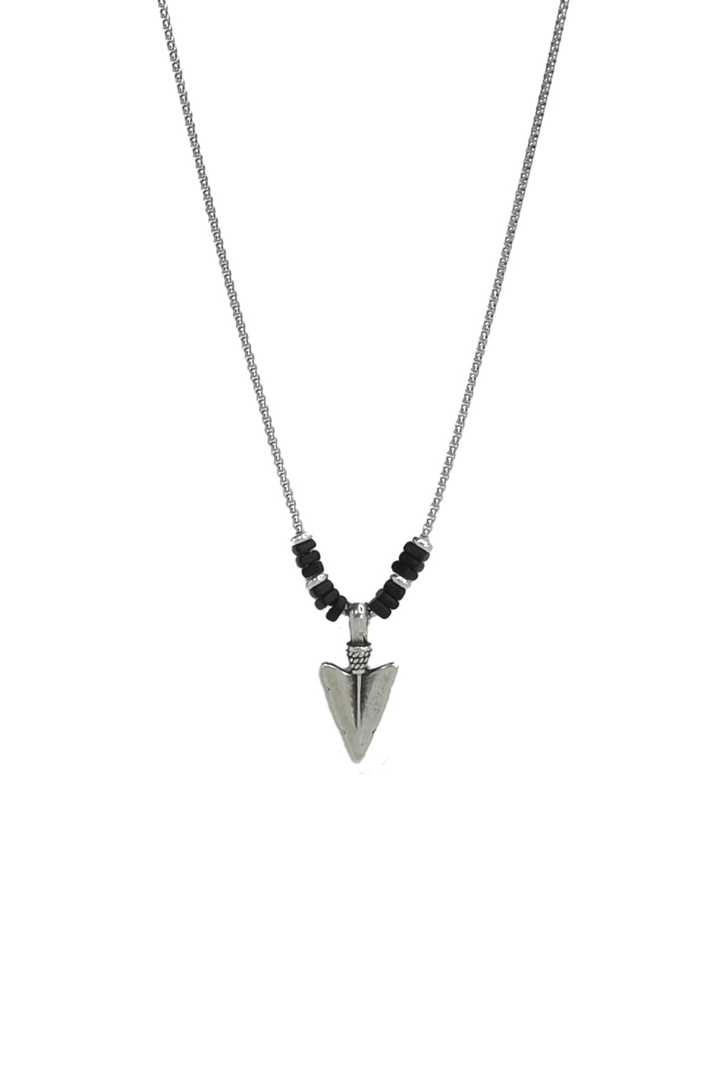 Η ασημί πυκνοπλεγμένη αλυσίδα, το ελαφρώς αντικέ επιμετάλλωσης βέλος – λόγχη στο κέντρο και οι μαύρες κεραμικές πέτρες σε κάθε πλευρά του, συνθέτουν ένα κολιέ με ethnic chic τόνο που μπορεί να φορεθεί τόσο μόνο του, όσο και layered με το άλλο κολιέ του set ROGUE, για ένα πιο οπτικά δυνατό αποτέλεσμα.