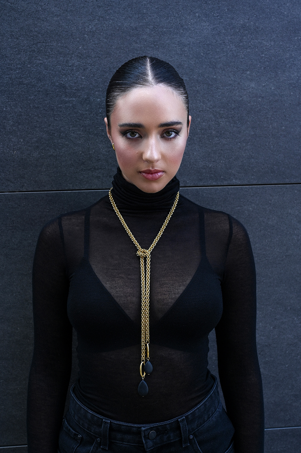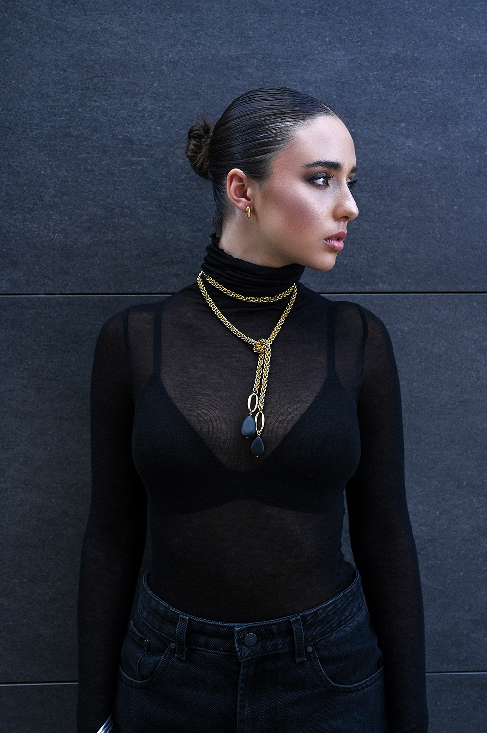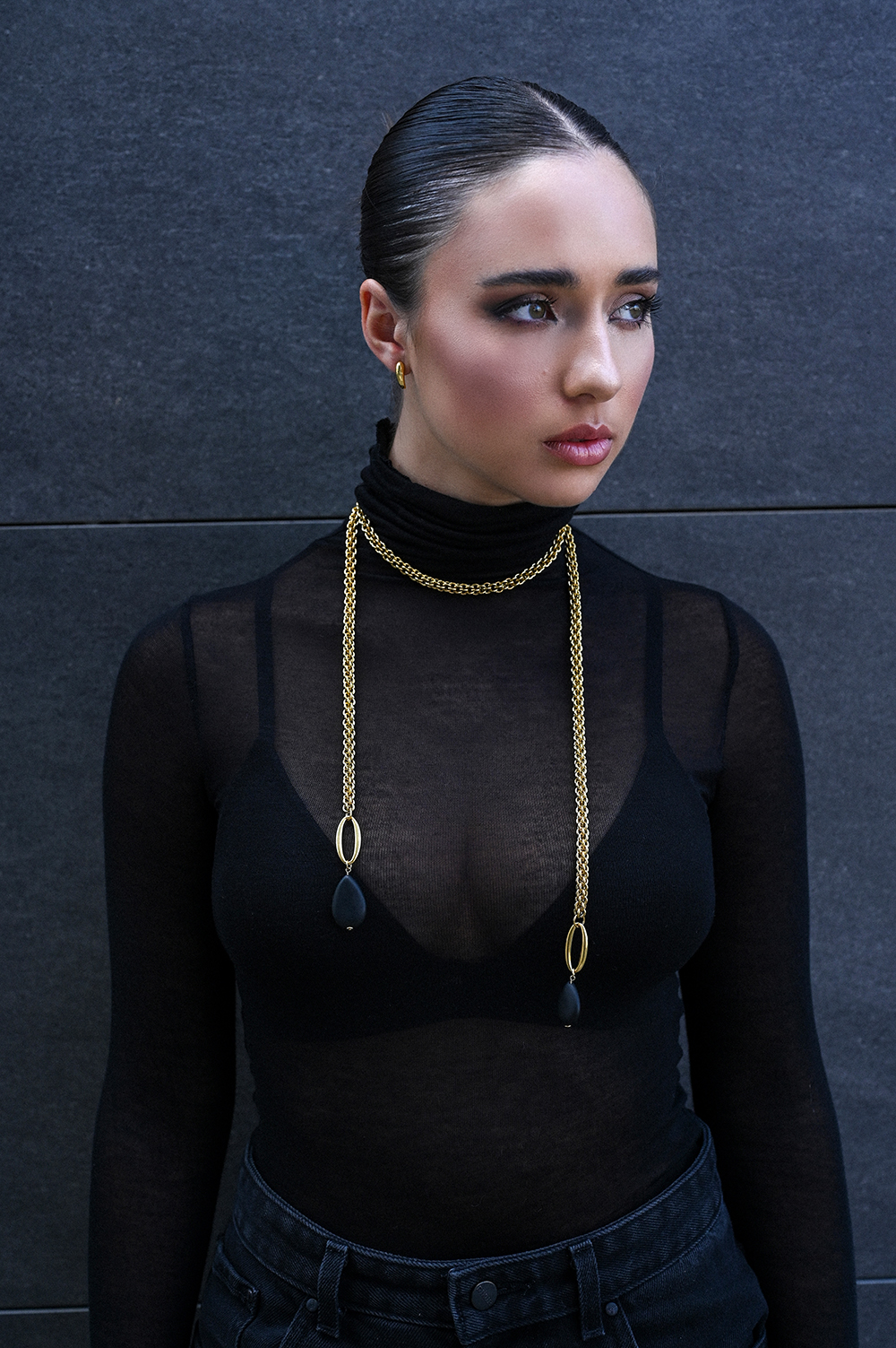 Ένα κολιέ πολυμορφικό, που με το ύφος και τη δομή του συνδυάζει κομψότητα και σύγχρονη δυναμική. Στον all time classic συνδυασμό του χρυσού με το μαύρο, με plot twist την αντίθεση της λείας, χυτής αλυσίδας με την ματ σατινέ επιφάνεια του οψιδιανού.
