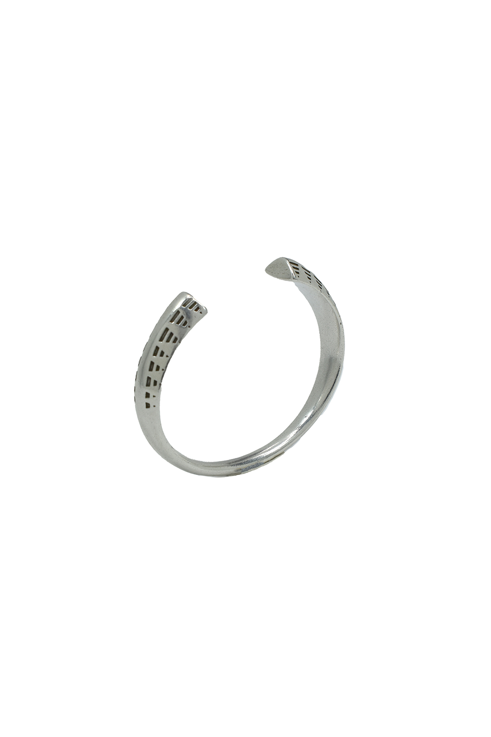 Ένα ασημί βραχιόλι χειροπέδα από τη συλλογή Urban Code, με λεπτομέρειες που παραπέμπουν σε ethnic μοτίβα.